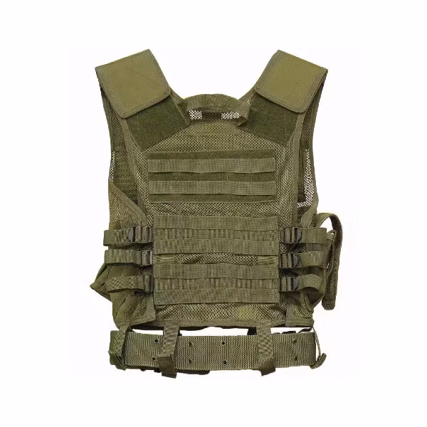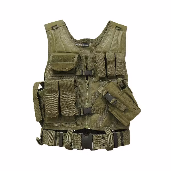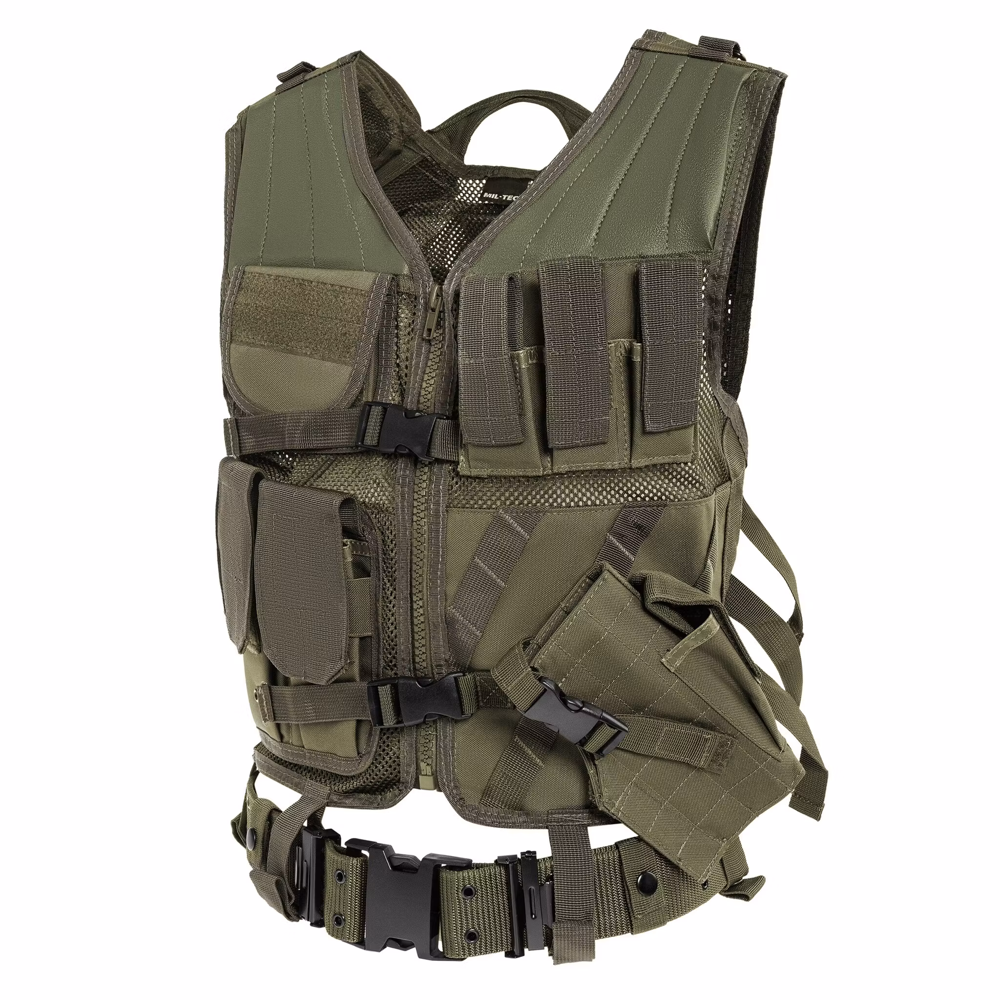Taktisk Cross draw stridsväst i 100% polyester. Utrustad med 3st magasinfickor passande för G36/M4/M16/AK-47 magasin, 3st fickor för pistolmagasin samt en universalficka. Västen har även ett avtagbart pistolhölster med en magasinficka på hölstret.