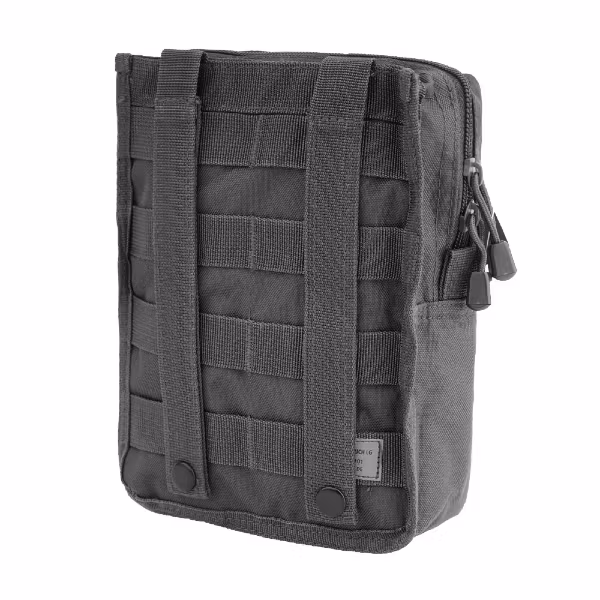 Large universal polyester pocket, attached to the tactical belt. Double zipper, ventilated, elasticized straps and compartment inside, MOLLE system straps and Velcro panel on the front.
