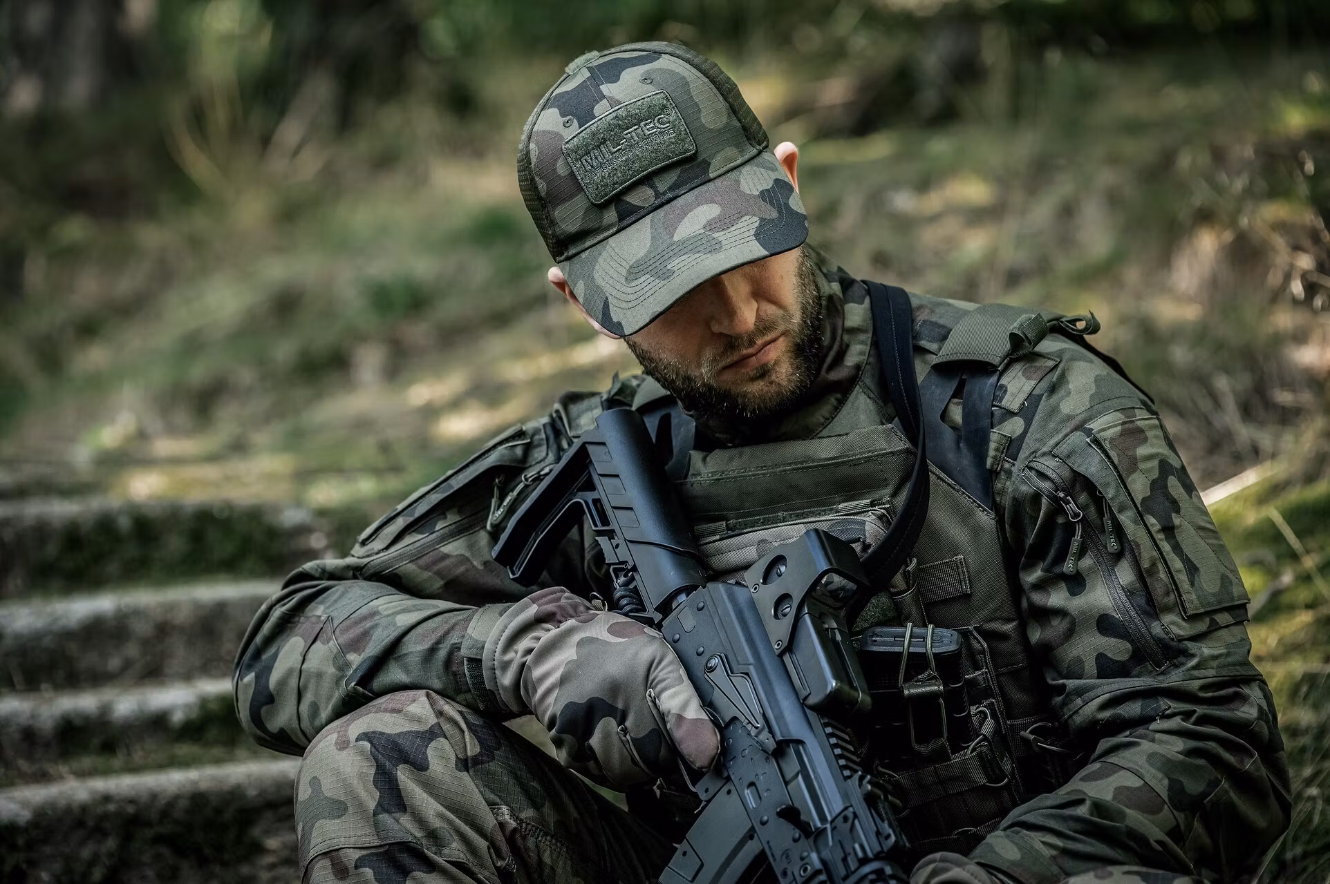 Stridsväst & Plattbärare från Mil-Tec med integrerade fickor för M4 och AK-magasin, då fickorna håller väldigt låg profil så är det inga problem att montera andra typer av fickor över magasinsfickorna. MOLLE-system finns runtom. Framsidan är utrustad med tre magasinfickor och tre elastiska öglor för att fästa magasinen. Västen går att öppna helt framåt med tre starka krokar och öglor, och axelremmarna kan också öppnas. Det går även snabbt att sätta på och ta av västen genom elastiska öglor på baksidan.