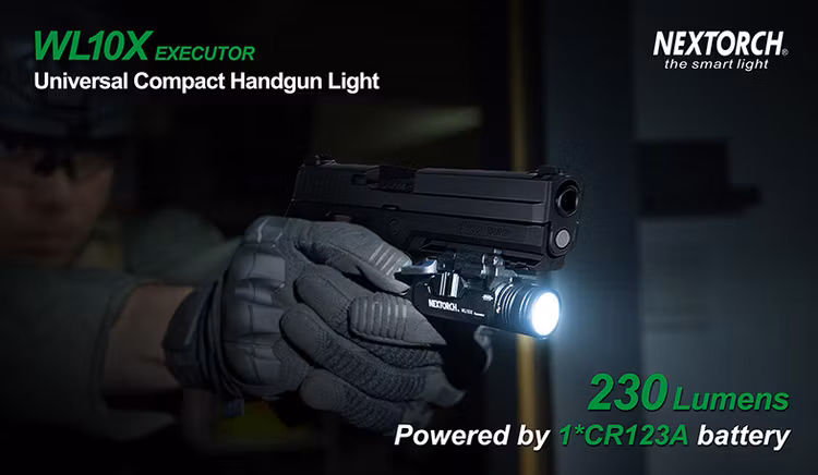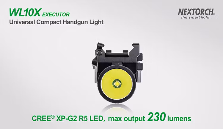 Nextorch vapenlampa med 230 lumen som levereras med CR123A batteri samt ett universalfäste för skena som möjliggör montering för de flesta weaver/picatinny baser.