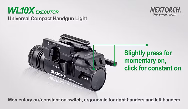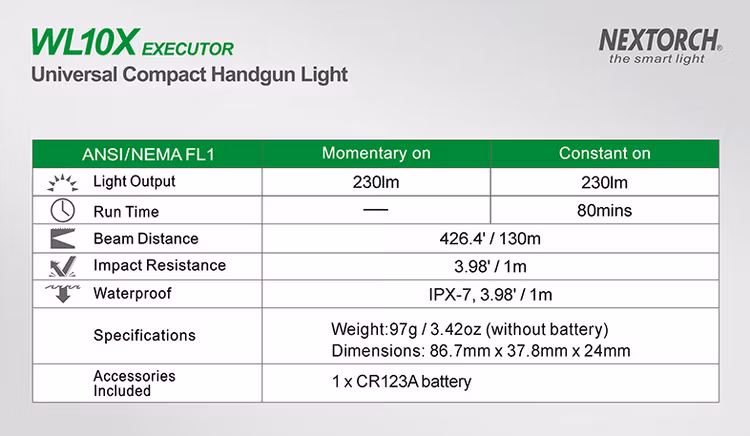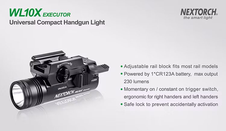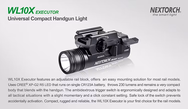 WL10X Executor features an adjustable rail block, offers an easy mounting solution for most rail models. Uses CREE® XP-G2 R5 LED that runs on single CR123A battery, throws 230 lumens and remains a very compact body that blends with the handgun. The ambidextrous trigger switch is ergonomically designed and adapts to all tactical situations with a slight momentary and a click constant setting. Safe lock of the switch prevents accidentally activation. Compact, rugged and reliable, the WL10X Executor is your first choice for the rail models.