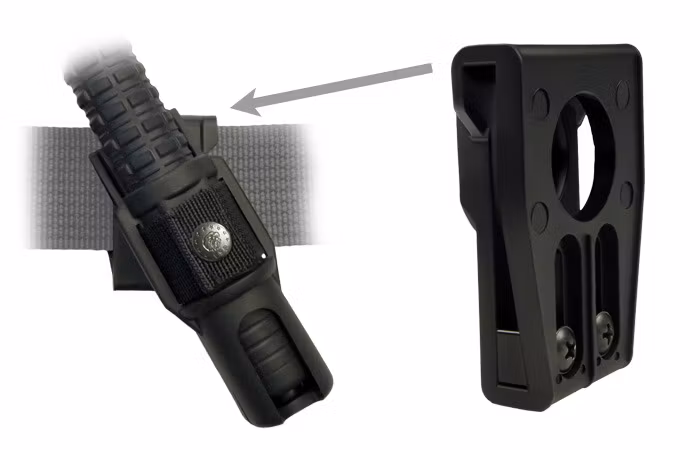Räfflat gummihandtag som ger mycket säkert grepp. Smart 360graders justerbart hölster i svart polymer medföljer. Batongen kan hölstras i utfällt läge.