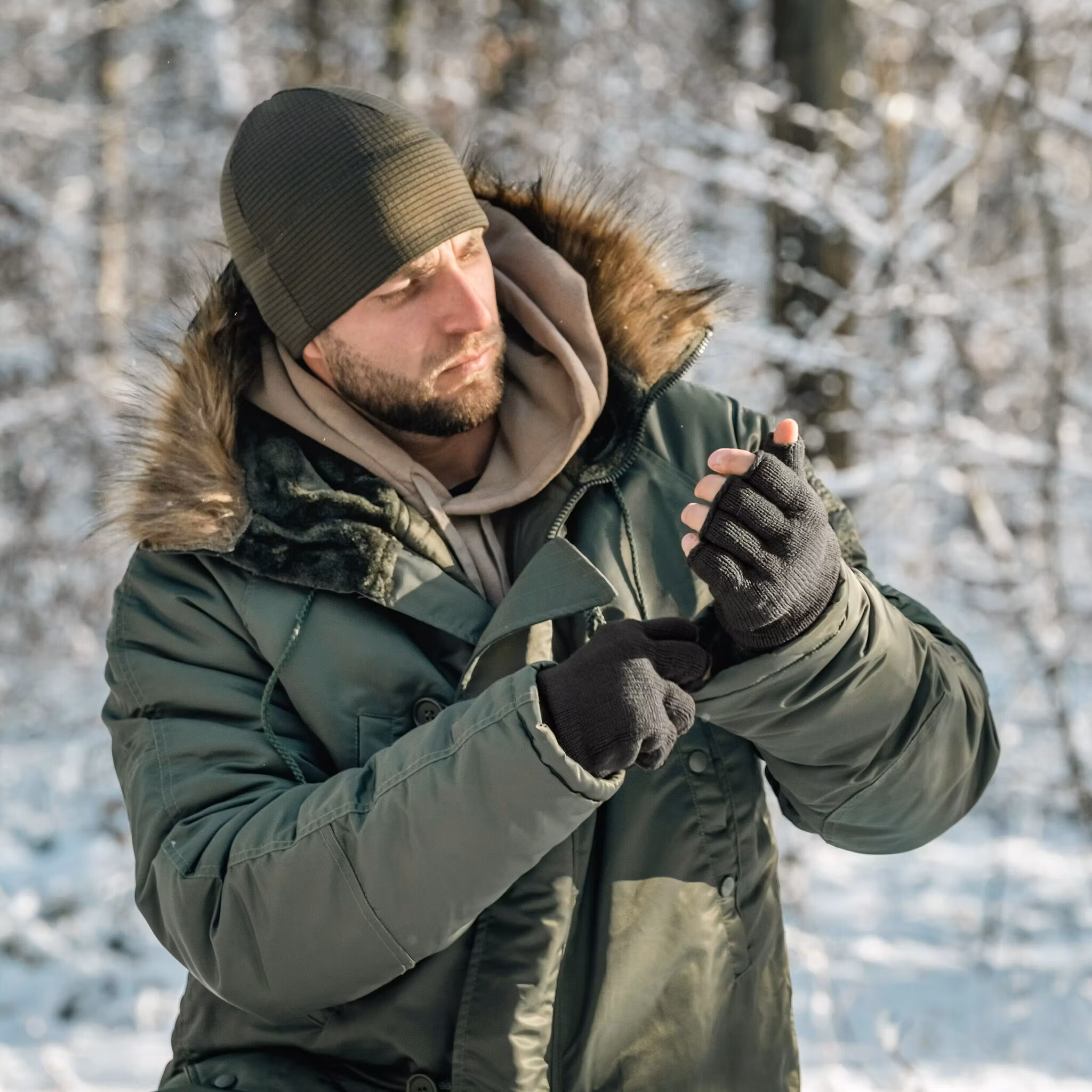 Fingerless winter gloves in Olive color, made of acrylic, which does not absorb moisture and helps maintain thermal comfort in low temperatures. The interior features 3M Thinsulate thermal insulation.