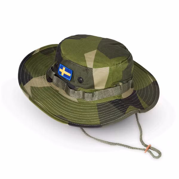 Nordic Army® Boonie Hat M90 kamouflage i twill 35% bomull och 65% polyester med mekanisk stretch. Hatten är behandlad för att vara vattenavvisande. Vattenavvisande tyg, att vattendroppar pärlar sig och rinner av plagget. Ventilationshål på sidan och åtdragbar haksond. Avtagbar svensk flagga tygmärke medföljer. Kardborreband sitter på sidan.