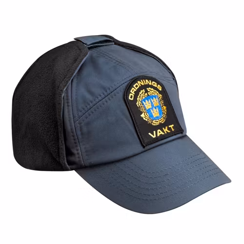 Ordningsvaktskeps med mössemblem. Försedd med flärpar som kan vikas upp eller bäras nedfällda.