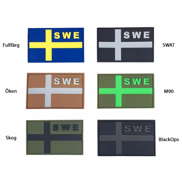 Svensk kardborreflagga av militärt snitt med text "SWE".