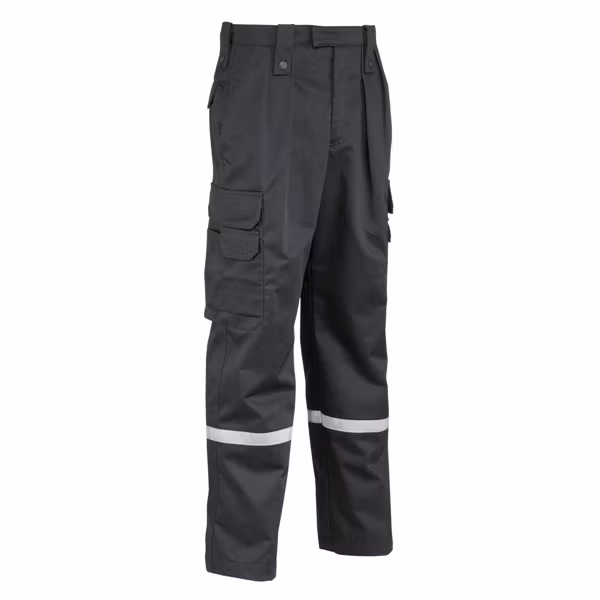 Byxa med raka benslut och reflexband. Fickor med kardborre knäppning på båda benen.