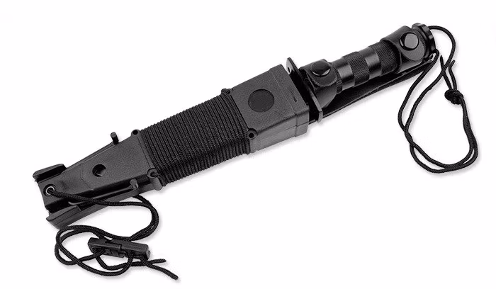The composite sheath has also: the blade with bottle opener, folding slingshot, a whetstone and extra nylon cord.